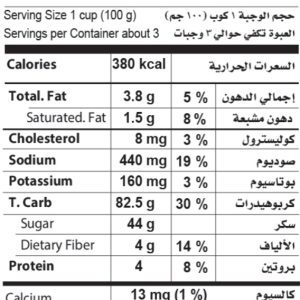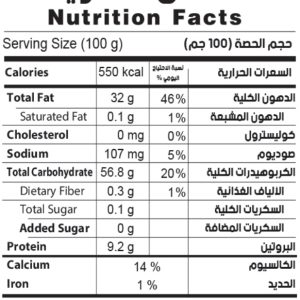 خالي من الجلوتين/ الصويا/ اللبن/ الذرة/البيض/المكسرات/المواد الحافظة/ بدون اضافات صناعية